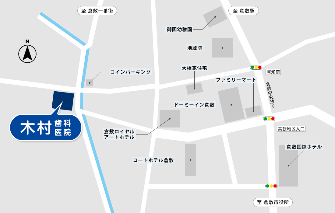 • 倉敷中央通り「美観地区入口」交差点から西へ、約250m直進してつきあたりにございます。